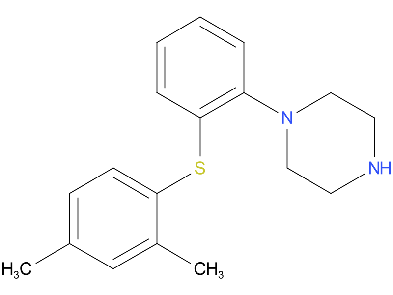 | vortioxetine | A piperazine derivative that acts as a serotonin reuptake inhibitor, as a 5-HT3 receptor antagonist, and 5-HT1A receptor agonist. It is used for the treatment of anxiety and depression. |