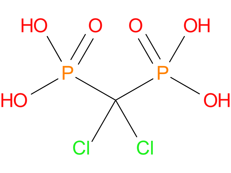 | clodronic acid | A diphosphonate which affects calcium metabolism. It inhibits bone resorption and soft tissue calcification. |