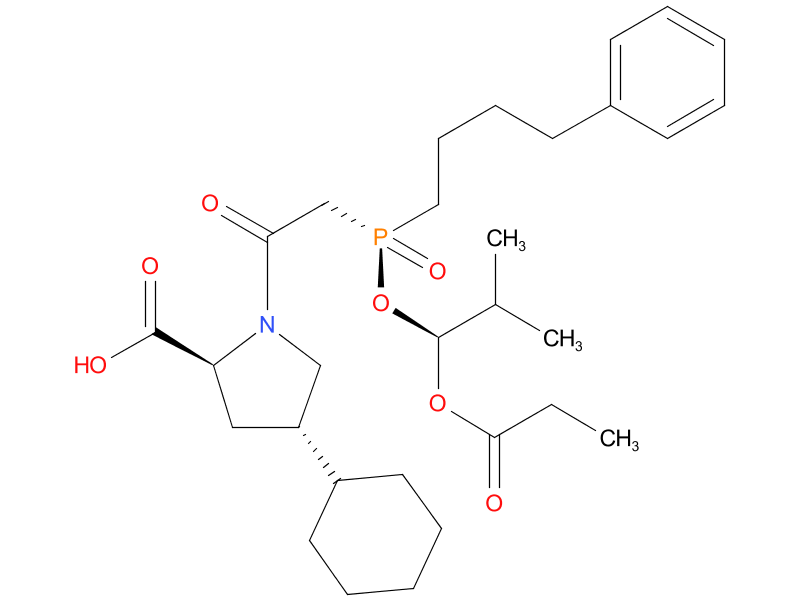 | fosinopril | A phosphinic acid-containing angiotensin-converting enzyme inhibitor that is effective in the treatment of hypertension. It is a prodrug that is converted to its active metabolite fosinoprilat. |