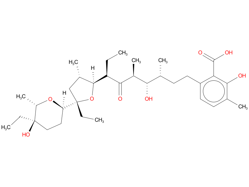| lasalocid | Cationic ionophore antibiotic obtained from Streptomyces lasaliensis that, among other effects, dissociates the calcium fluxes in muscle fibers. It is used as coccidiostat, especially in poultry |