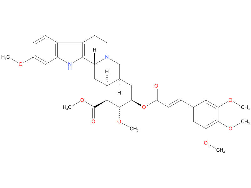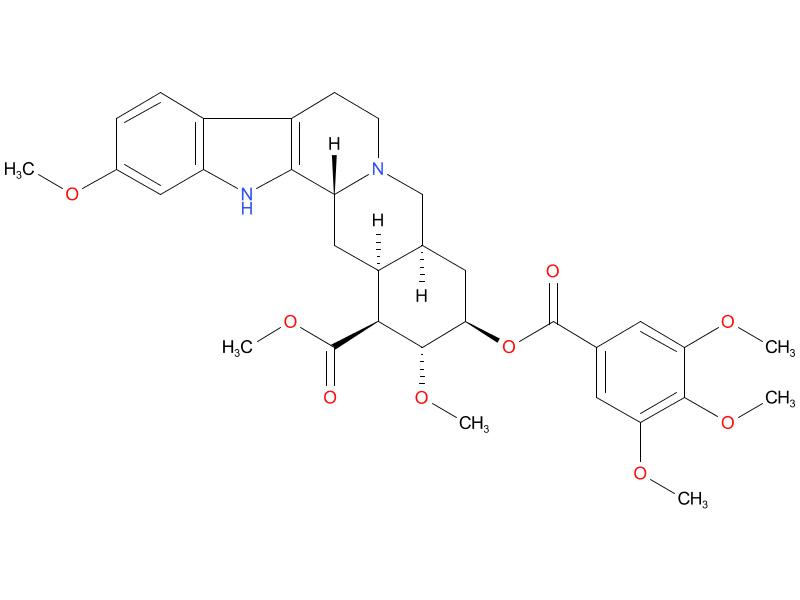 | reserpine | An alkaloid found in the roots of Rauwolfia serpentina and R. vomitoria. Reserpine inhibits the uptake of norepinephrine into storage vesicles resulting in depletion of catecholamines and serotonin from central and peripheral axon terminals. It has been used as an antihypertensive and an antipsychotic as well as a research tool, but its adverse effects limit its clinical use. |