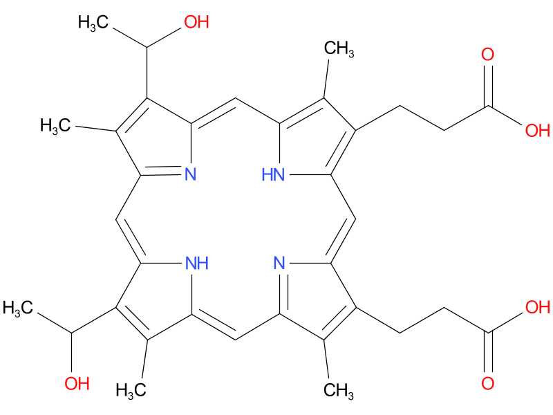 | hematoporphyrin | Iron-free derivatives of heme with 4 methyl groups, 2 hydroxyethyl groups and 2 propionic acid groups attached to the pyrrole rings. Some of these PHOTOSENSITIZING AGENTS are used in the PHOTOTHERAPY of malignant NEOPLASMS. |