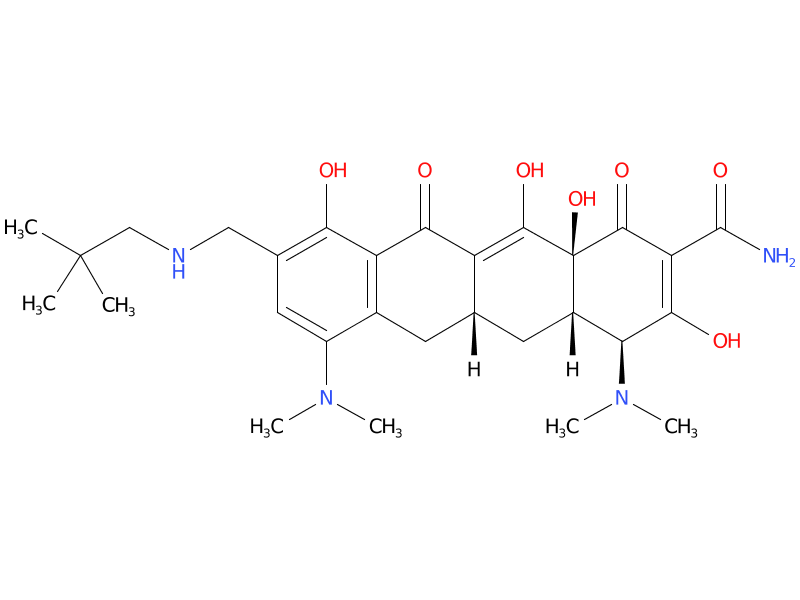 | omadacycline | Omadacycline is an aminomethylcycline antibacterial within the tetracycline class of antibacterial drugs. Omadacycline binds to the 30S ribosomal subunit and blocks protein synthesis. Omadacycline is active in vitro against Gram positive bacteria expressing tetracycline resistance active efflux pumps (tetK and tet L) and ribosomal protection proteins (tet M). In general, omadacycline is considered bacteriostatic; however, omadacycline has demonstrated bactericidal activity against some isolates of S. pneumoniae and H. influenzae. |